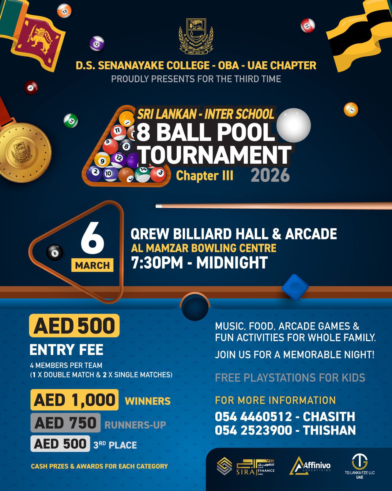 The Sri Lankan Inter-School 8 Ball Pool Tournament, organised by the past pupils of D. S. Senanayake College Old Boys’ Association, will be held on March 6, 2026, at QREW Billiard Hall & Arcade, Al Mamzar Bowling Centre. Bringing together old boys and cue sports enthusiasts from Sri Lankan schools across the UAE, this evening event promises friendly competition, camaraderie, and an opportunity to strengthen bonds within the vibrant Sri Lankan alumni community.